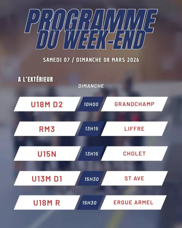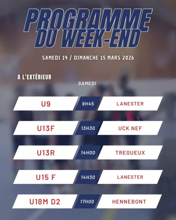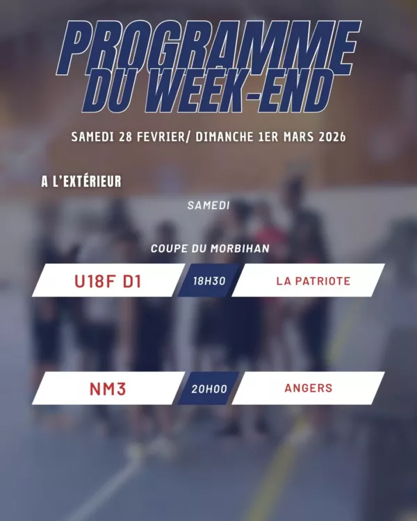 [ Programme du WE ] Nouvelle poule et nouveau challenge pour l’équipe de Fabien avec un 1er match face à Montfort samedi soir. On enchaîne avec un gros dimanche à Kervaric avec les U15R en matinée puis les PNF face à Rennes PA, 1ere et invaincue, et pour terminer ces vacances les U18N reçoivent Limoges…