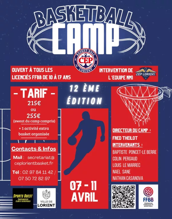 Les inscriptions à la 12eme édition du basket Camp sont ouvertes ! Du 7 au 11 avril 2025 Avec l’intervention de la Team NM1 du Cep Lorient Basket : https://www.cep-lorient-basket.bzh/ Le fichier d’inscription est disponible ici sur Google Doc ou ici au format PDF : https://ceplorientbasket.fr/wp-content/uploads/2025/02/inscriptions-basket-camp-avril-2025.pdf